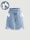 女童夏季休闲牛仔短裤,饰有心形贴布——宽松版型,松紧腰带,做旧蓝色设计,实用口袋,适合户外玩耍和休闲穿着