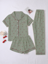 3 件泡泡褶樱桃印花女式睡衣套装 - 短袖纽扣领上衣和短裤 + 长裤
