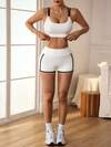 Dewbera 女士罗纹边饰露脐背心短裤套装 棕色运动文胸健身两件套 运动文胸短裤套装 两件套运动套装 两件套瑜伽套装 健身套装