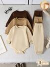 SHEIN Vintaside Kids 男婴圆领长袖纯色连体衣三件套,黑色、白色和灰色可选,时尚简约,图案设计搭配优雅纯色,宽松版型适合不同体型。三件套包含一件连体衣上衣和三条无腰带长裤,适合多种场合:户外玩耍休闲自在;居家休闲舒适;运动灵活自如。