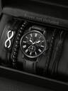 5 条男式黑色 PU 皮革表带,时尚、休闲、商务、混合刻度、日历功能、圆形表盘、石英表手链套装,适合日常佩戴、装饰、送给朋友或父亲的节日礼物