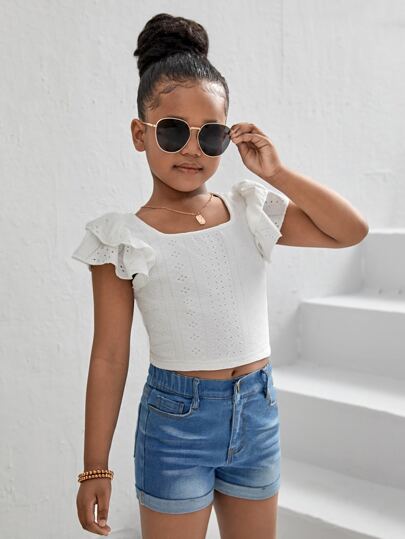 SHEIN 青少年女孩白色休闲T恤,方形领口,多层荷叶边袖子,适合夏季、度假、夏季、旅行 - 白色 - 查看 5