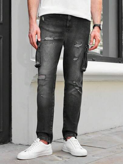 RueChic 男士破洞口袋破損水洗牛仔褲 - 黑色 - 查看 1