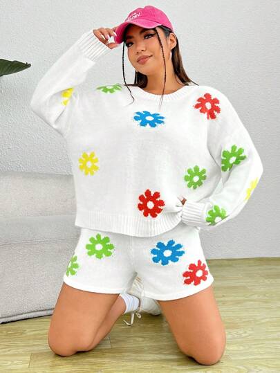 SHEIN EZwear 大碼花卉圖案落肩袖套頭毛衣&針織短褲 - 彩色 - 查看 1