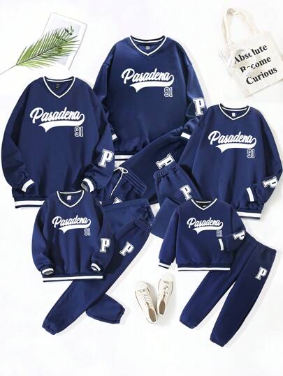 SHEIN Tween 女童休闲学院风 V 领字母印花运动衫和灯芯绒裤子套装,带保暖内衬,秋冬,家庭装,妈妈和我(套装单独出售) - 藏蓝色 - 查看 1
