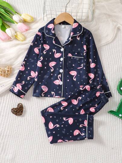 年轻女孩可爱火烈鸟印花长袖开衫和裤子两件套家居服套装带白色饰边 - 彩色 - 查看 1