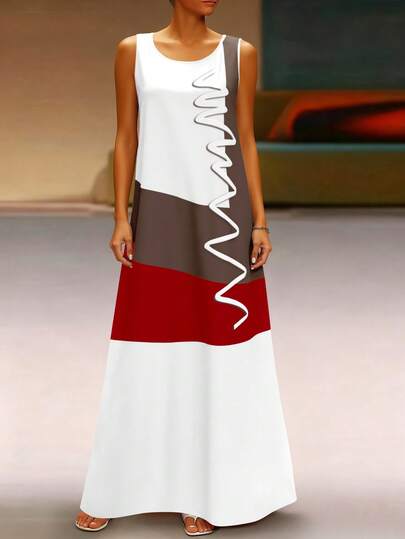 EMERY ROSE 女士无袖印花撞色连衣裙,无口袋,夏季长款女装 - 白色 - 查看 1