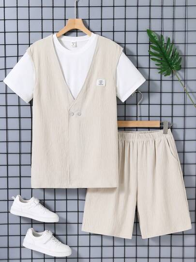 青少年男孩純色紋理圖案背心短褲t卹套裝 - 卡其色 - 查看 1