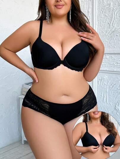 大尺碼蕾絲接著前開扣內衣套裝 - 黑色 - 查看 1