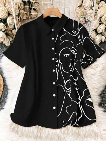 SHEIN LUNE 大码抽象印花纽扣长袖衬衫,夏季 - 黑色 - 查看 1