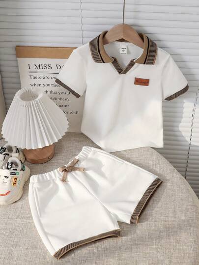 SHEIN 2 件套年轻男孩毕业领短袖 Polo 衫和短裤套装 - 白色 - 查看 1
