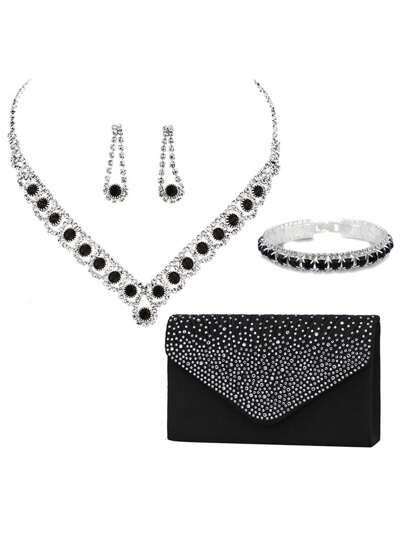 女性晚宴豪華優雅鑲嵌鑽石手提包鏈條肩包連連衣裙手提袋,配可調節手鏈、耳環和項鍊套裝 - 黑色 - 查看 1