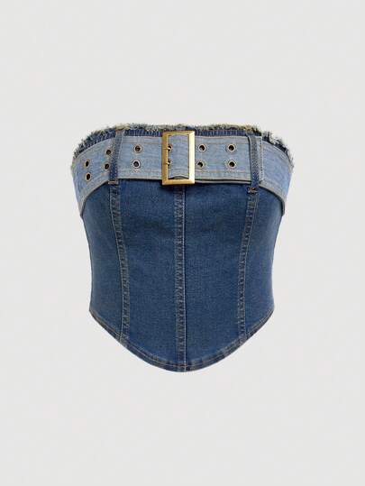 SHEIN 少女Y2K露肩直領修身牛仔上衣,配皮帶扣細節,適用於音樂會和音樂節穿搭 - 中等水洗藍 - 查看 1