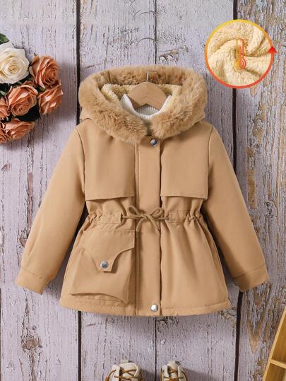 SHEIN 年轻女孩休闲保暖内衬连帽派克大衣,配有可拆卸蓬松领子,中长款防风外套,适合秋冬季保暖 - 卡其色 - 查看 1