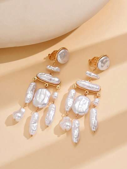 2 件不对称巴洛克仿珍珠夹式耳环,夸张流苏吊坠耳环,无穿孔 - 白色 - 查看 2
