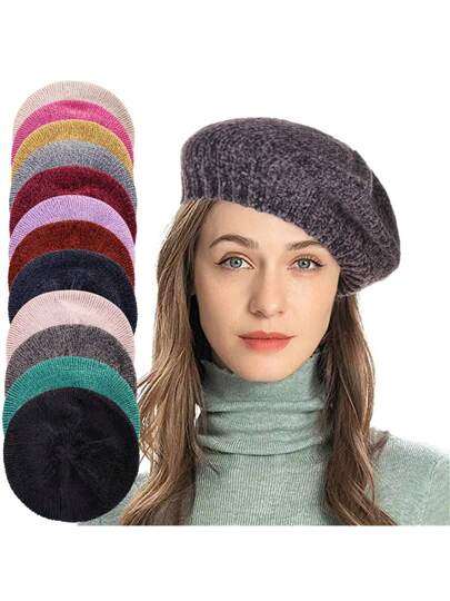 Z.H.A 1 件女士时尚针织贝雷帽 - 编织涤纶帽,弹性舒适,轻便画家风格帽,百搭时尚配饰,适合秋冬季节 - 多色 - 查看 12