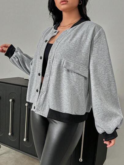 SHEIN Privé 大码女式灰色撞色棒球夹克,温暖舒适,适合秋冬季 - 灰色 - 查看 1