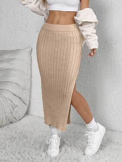 SHEIN Unity 女士纯色侧开衩下摆休闲针织裙,秋冬 - 米色 - 查看 1