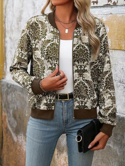 SHEIN LUNE 休闲女式全身植物印花拉链飞行员夹克,长袖 - 杏色 - 查看 1