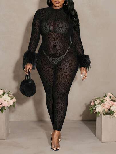 Slaydiva Slayr 优雅 & 派对 & 聚会 & 约会:大码女式性感透视黑领长袖连体裤,透视弹力豹纹植绒面料,及踝长度,适合秋季(人造毛皮) - 黑色 - 查看 1