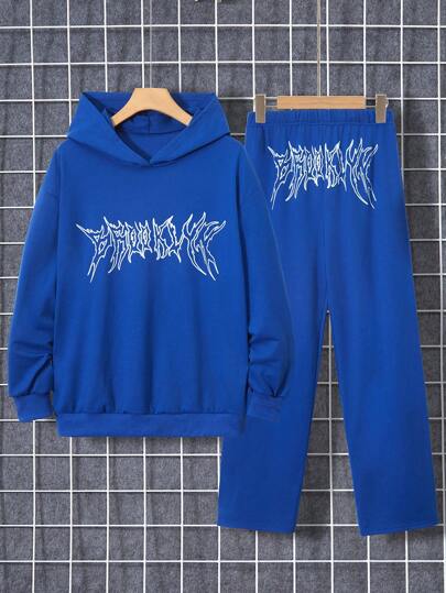 2 件青少年男童基本款休闲运动风格长袖上衣和裤子套装 - 寶藍色 - 查看 2