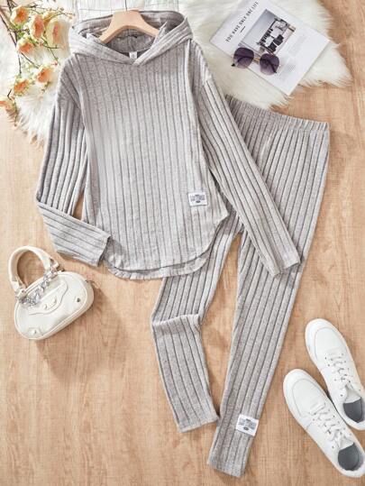 少女长袖印花连帽上衣和罗纹裤两件套,休闲甜美 - 杏色 - 查看 6