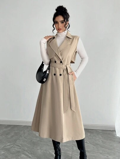 SHEIN Privé 女士卡其色修身A字长款无袖风衣,春秋季风衣,基本款荷叶边风衣,通勤女士风衣,女士风衣,斜纹风衣,系带风衣,修身A字风衣。 - 卡其色 - 查看 6