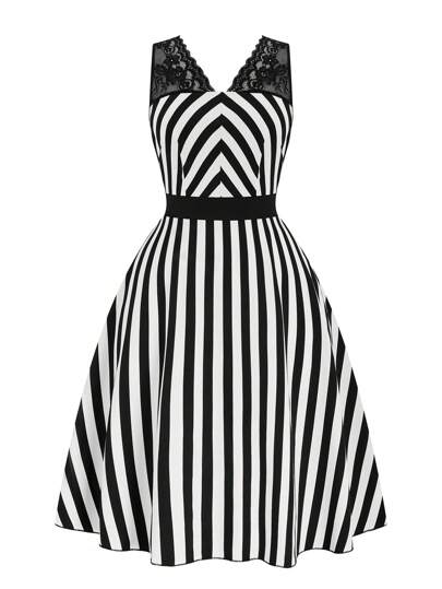 SHEIN Clasi 大码女式经典黑白条纹撞色蕾丝无袖修身连衣裙 - 黑與白 - 查看 1