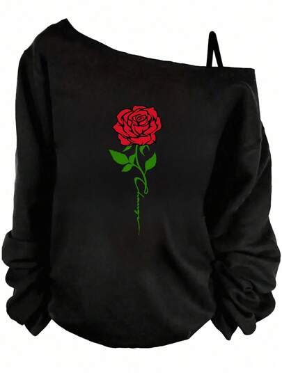 SHEIN Essnce 女士休闲简约玫瑰图案落肩长袖 T 恤 - 黑色 - 查看 1
