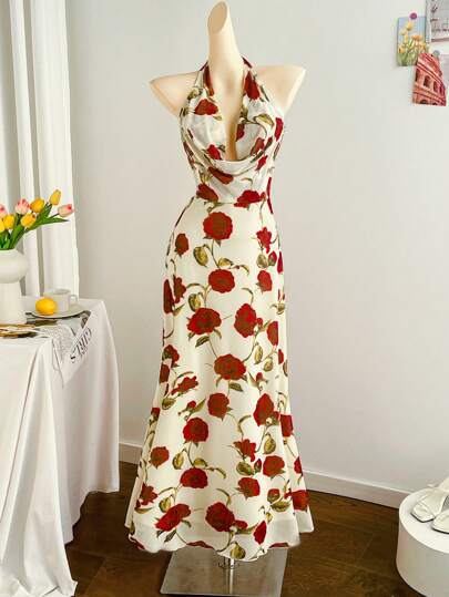 Soleia 全新春夏露背玫瑰花卉印花长款弹力网眼连衣裙,带吊带 - 彩色 - 查看 5