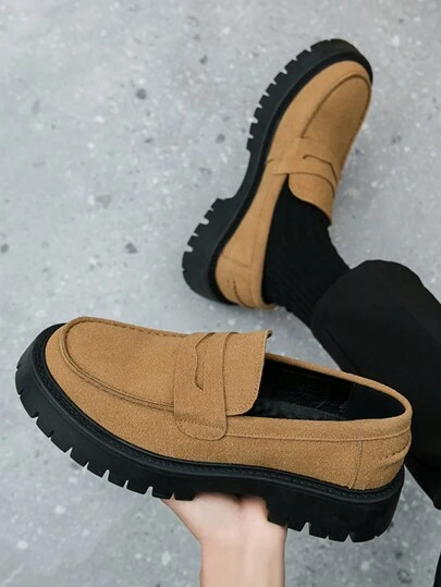 男士圆头厚底棕色低帮乐福鞋,休闲英伦风大头鞋 - 棕色 - 查看 1
