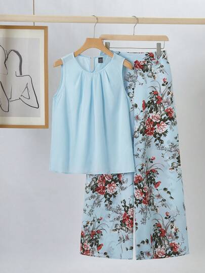 SHEIN Clasi 2 件套女士雪纺纯色衬衫和花卉阔腿裤优雅套装 - 淺藍色 - 查看 1