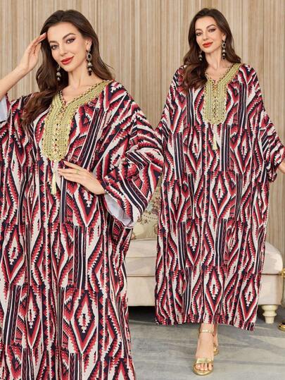 Al Najma 女士几何印花蝙蝠袖宽松阿拉伯风格连衣裙 - 彩色 - 查看 1