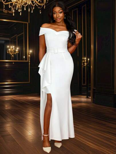 露肩优雅女士长款新娘白色连衣裙荷叶边开衩婚礼派对新娘送礼会礼服配腰带,毕业礼服,新娘 - 白色 - 查看 1