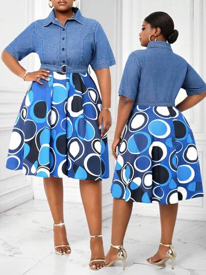 SHEIN Lady 大码牛仔拼布印花面料及膝连衣裙配腰带复活节圣帕特里克春假 - 中等水洗藍 - 查看 1