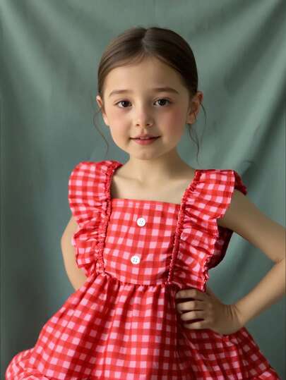 SHEIN 女童格纹无袖休闲连衣裙,田园风格 - 粉色 - 查看 1