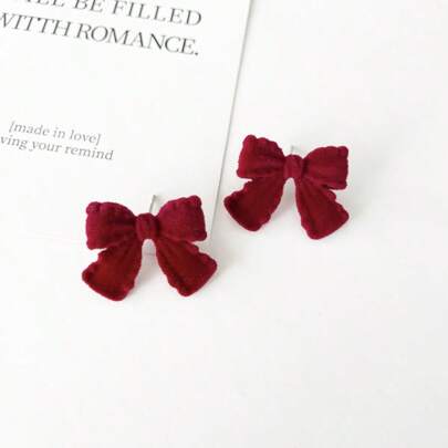 复古法国酒红色镂空心形银针耳环,新年版,优雅植绒蝴蝶结耳环,婚礼珠宝 - EZ-1678 2號 小號酒紅 - 查看 2