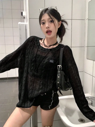 韩版休闲百搭灰色镂空长袖麻花针织衫女款轻薄宽松套头衫适合初秋叠穿 - 黑色 - 查看 1