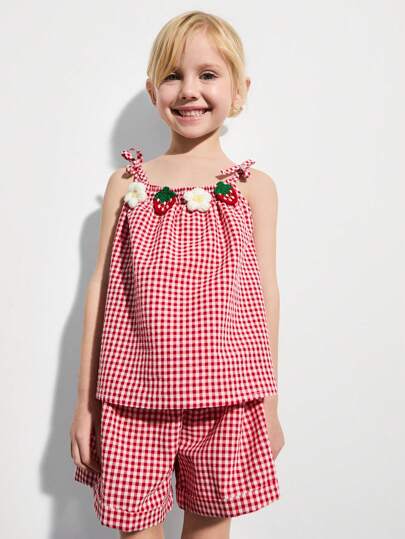 SHEIN 年轻女孩草莓蝴蝶结吊带上衣和短裤套装 - 彩色 - 查看 1