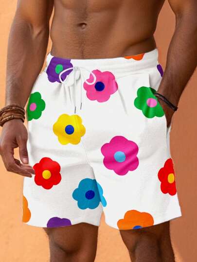 Manfinity VCAY 男士休闲编织抽绳腰彩色花卉印花短裤 - 白色 - 查看 1