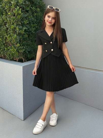 SHEIN Nova Glow Tween 女童街头时尚休闲纯色短袖开衫和百褶迷你裙套装 - 黑色 - 查看 1