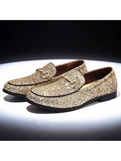 男士时尚乐福鞋平底驾车鞋闪光皮革布洛克鞋一脚蹬金色/银色闪亮舞台表演婚礼派对鞋 - 金色 - 查看 1
