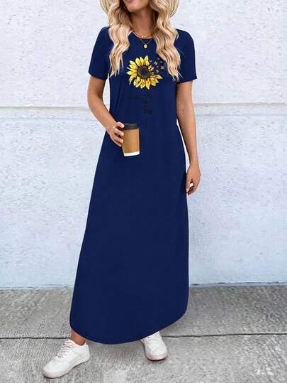 EMERY ROSE 女式夏季向日葵印花 T 恤款式连衣裙长款女装 - 藏蓝色 - 查看 1