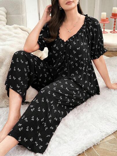 CottageSlumber 大码领带蝴蝶结印花荷叶边流苏装饰短袖上衣和裤子睡衣套装 - 黑色 - 查看 1
