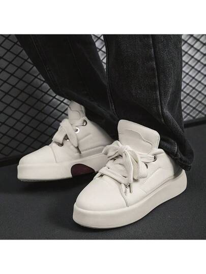 厚底男鞋,男士厚底休闲运动鞋,年轻男士户外时尚百搭面包鞋,皮面滑板鞋,街头时尚经典系带圆头男鞋,适合派对、度假、日常穿着 - 白色 - 查看 1