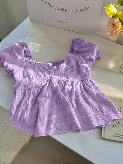 SHEIN Unity 女式红色领口短袖纹理面料纽扣腰衬衫 - 淡紫色 - 查看 1