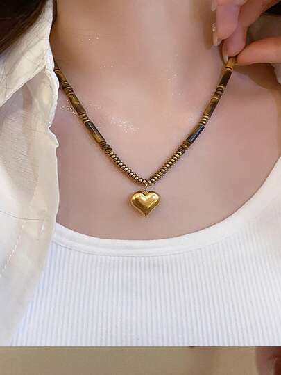 复古气质多层虎眼石吊坠项链女士不锈钢双层锁骨链套装首饰,女士日常派对配饰,时尚珠宝,最佳朋友礼物(天然石颜色随机) - 棕色 - 查看 13