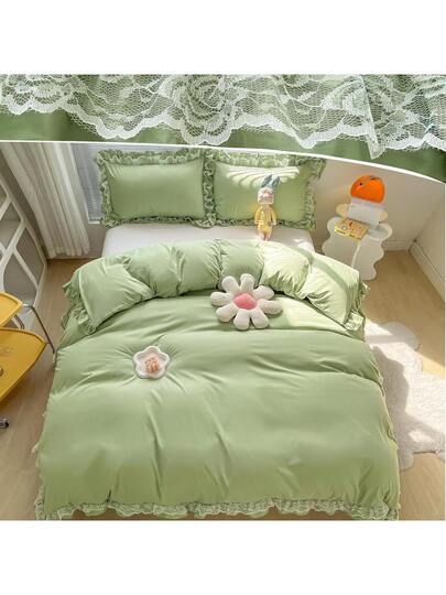 3 Pieces Green Soft Microfiber Bedding Set Frills Duvet Cover Set With 2 Pillowcase, Zipper Closure, Suitable For King And Double Size Bed In Home Decor Bedroom, Valentine's Day Gifts, Fall Decor, All Season - Lace (Green) - 查看 1