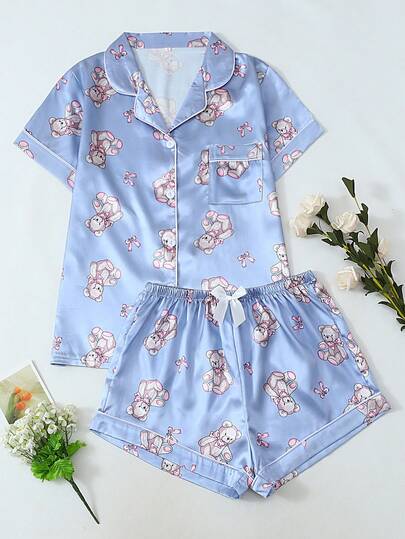 熊印花女士府绸短袖短裤睡衣套装 - 藍色 - 查看 1