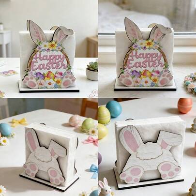 1/2个可爱复活节兔子、花朵和彩蛋图案木质餐巾架,农舍风格桌面装饰,适用于厨房、餐厅、春季节日